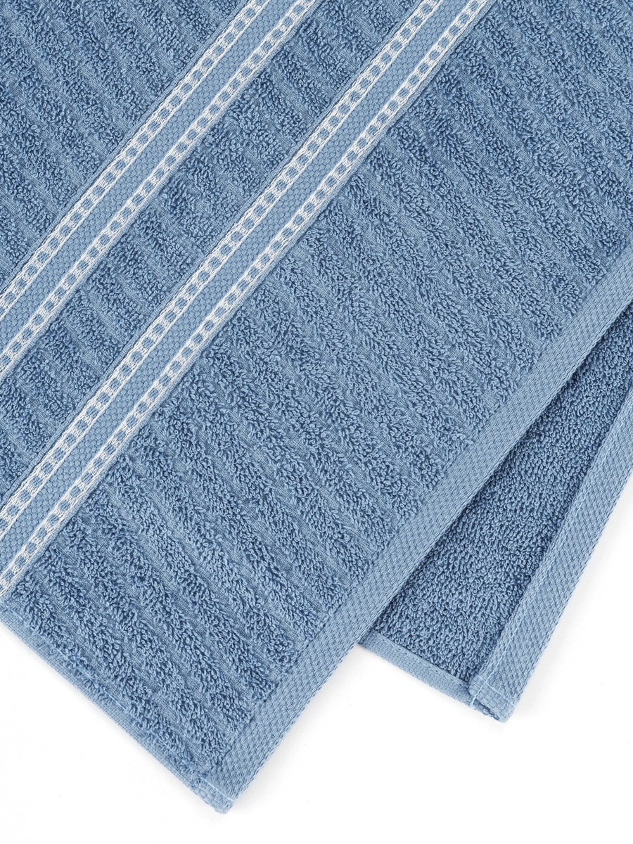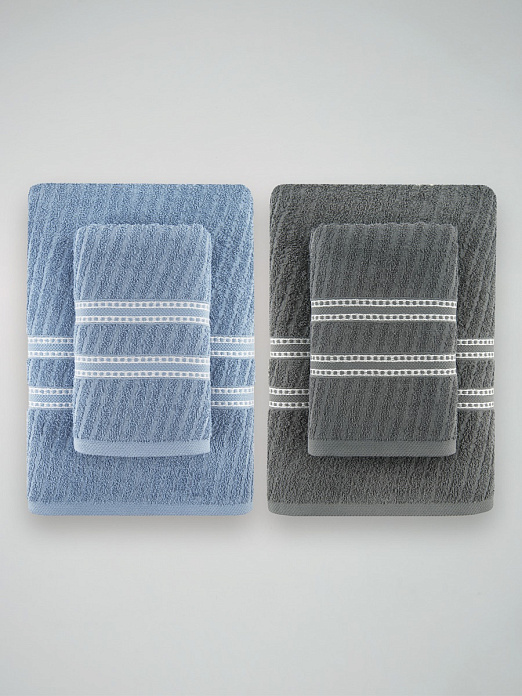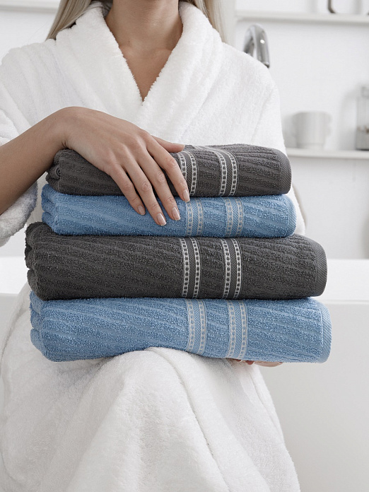 Такой изящный и стильный комплект станет хорошим подарком для интерьера ванной комнаты. Полотенца выполнены из 100% хлопка и сохраняют свой цвет даже после многочисленных стирок. В наборе используются благородные, приятные серо-голубые оттенки, которые подойдут к любому интерьеру ванной комнаты. Для удобства использования на полотенцах предусмотрена петелька на широкой стороне. Она вшита в шов и совпадает с цветом полотенца.