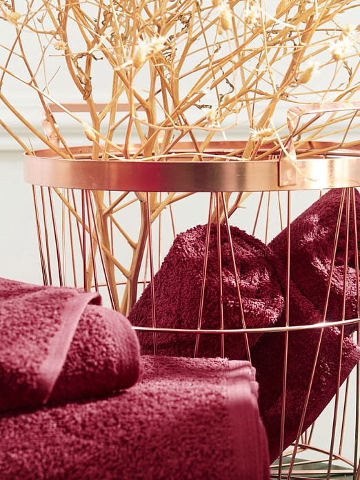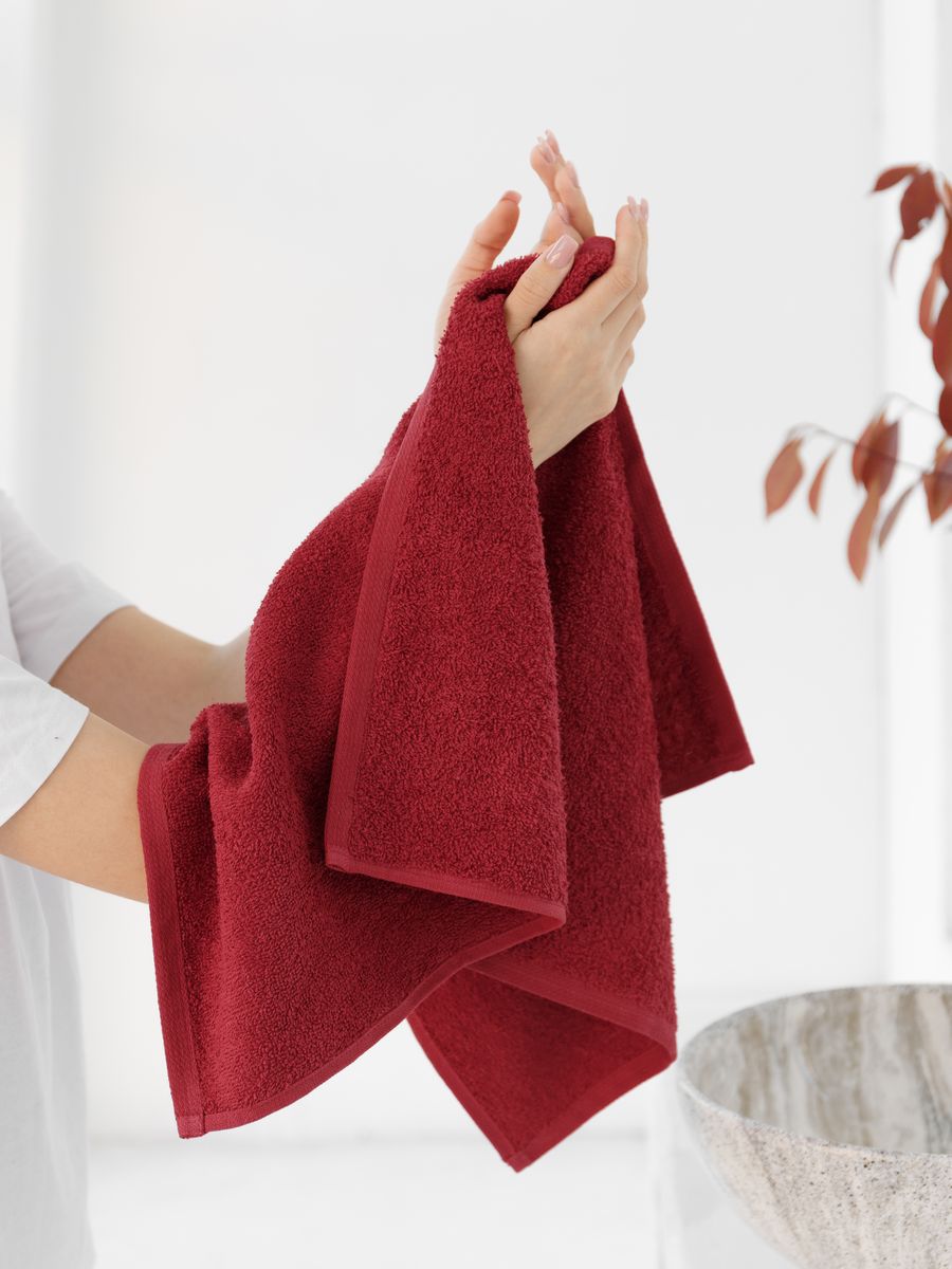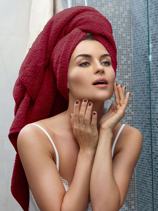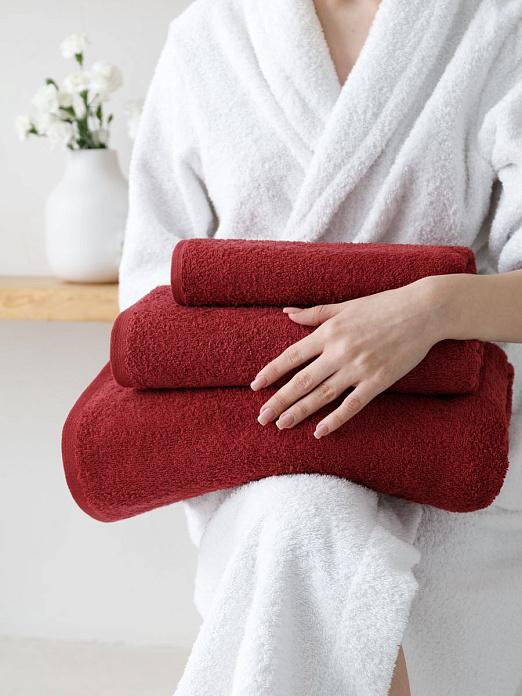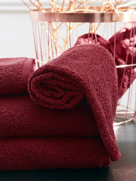 Представляем вам полотенца глубокого и очень красивого темно-красного цвета (гранат). Они хорошо впишутся в интерьер любой ванной. Рекомендуем вам приобрести сразу комплект ярких однотонных махровых полотенец, так как в этой серии четыре размера, которые можно использовать для рук, ног, лица, волос и тела: 40х70, 50х90, 70х140, 100х150 см.