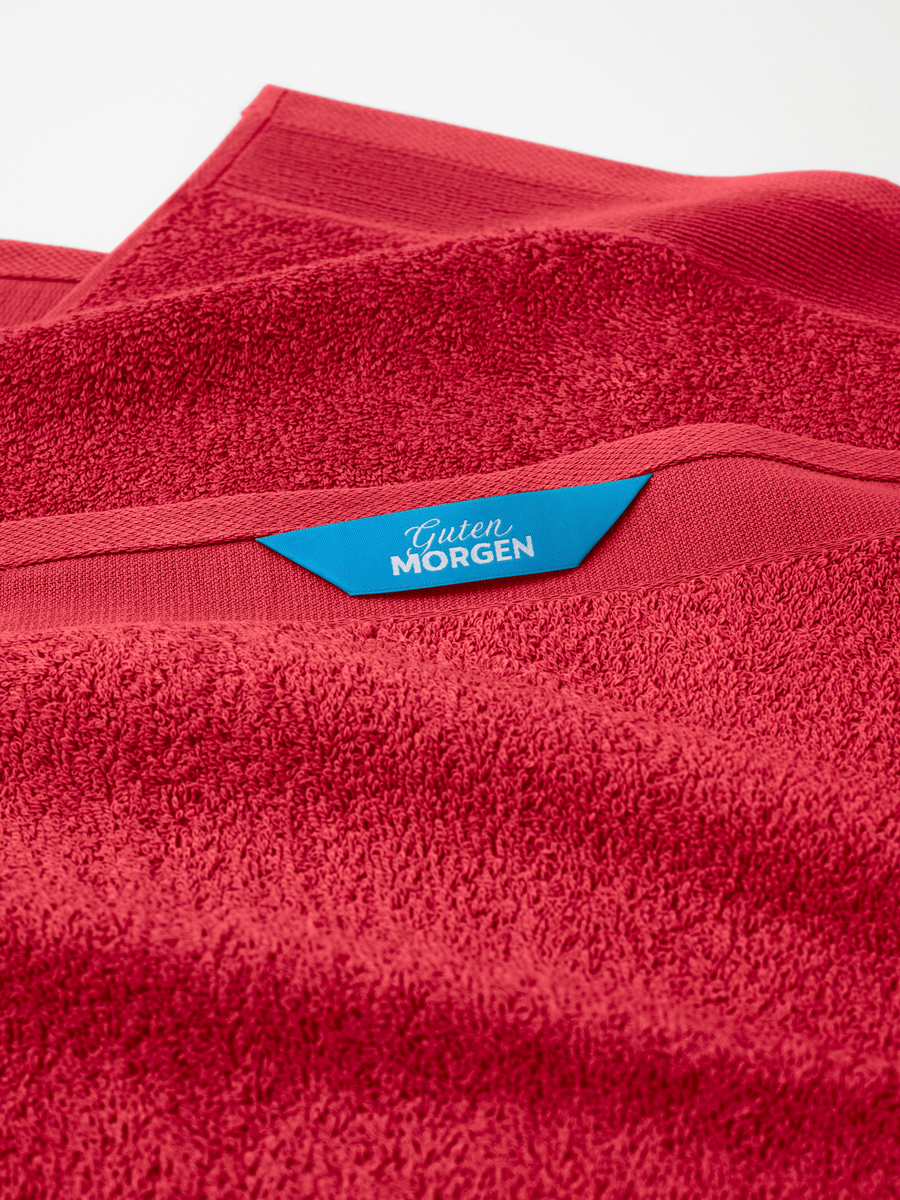 Полотенца глубокого, богатого оттенка красного цвета не только украшают ванну. Они мягко и деликатно впитывают влагу с кожи, хорошо стираются и долго сохраняют форму и цвет. Премиальный домашний текстиль Гутен Морген – это натуральное сырье, высокое качество пошива и стильный, современный дизайн